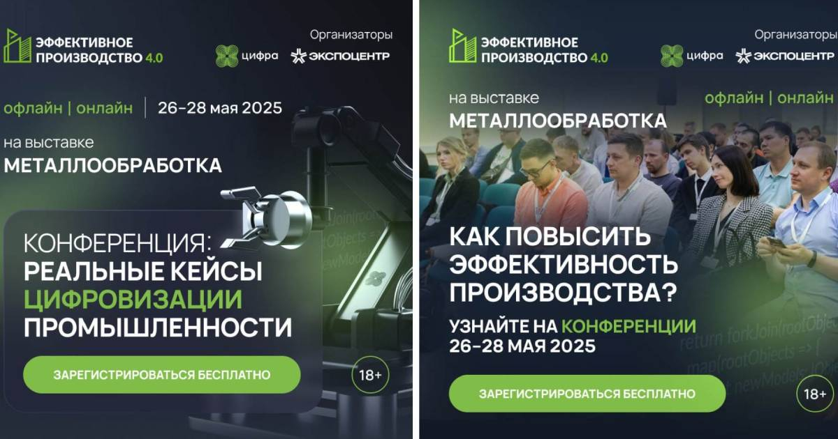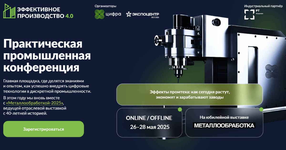 Один из наших клиентов ежегодно обращается к нам с запросом на продвижение промышленной конференции «Эффективное производство 4.0». В 2025 году ее организаторами выступили Дивизион машиностроения и металлообработки ГК «Цифра» и «Экспоцентр», был предусмотрен офлайн- и онлайн-формат мероприятия, регистрация бесплатна.