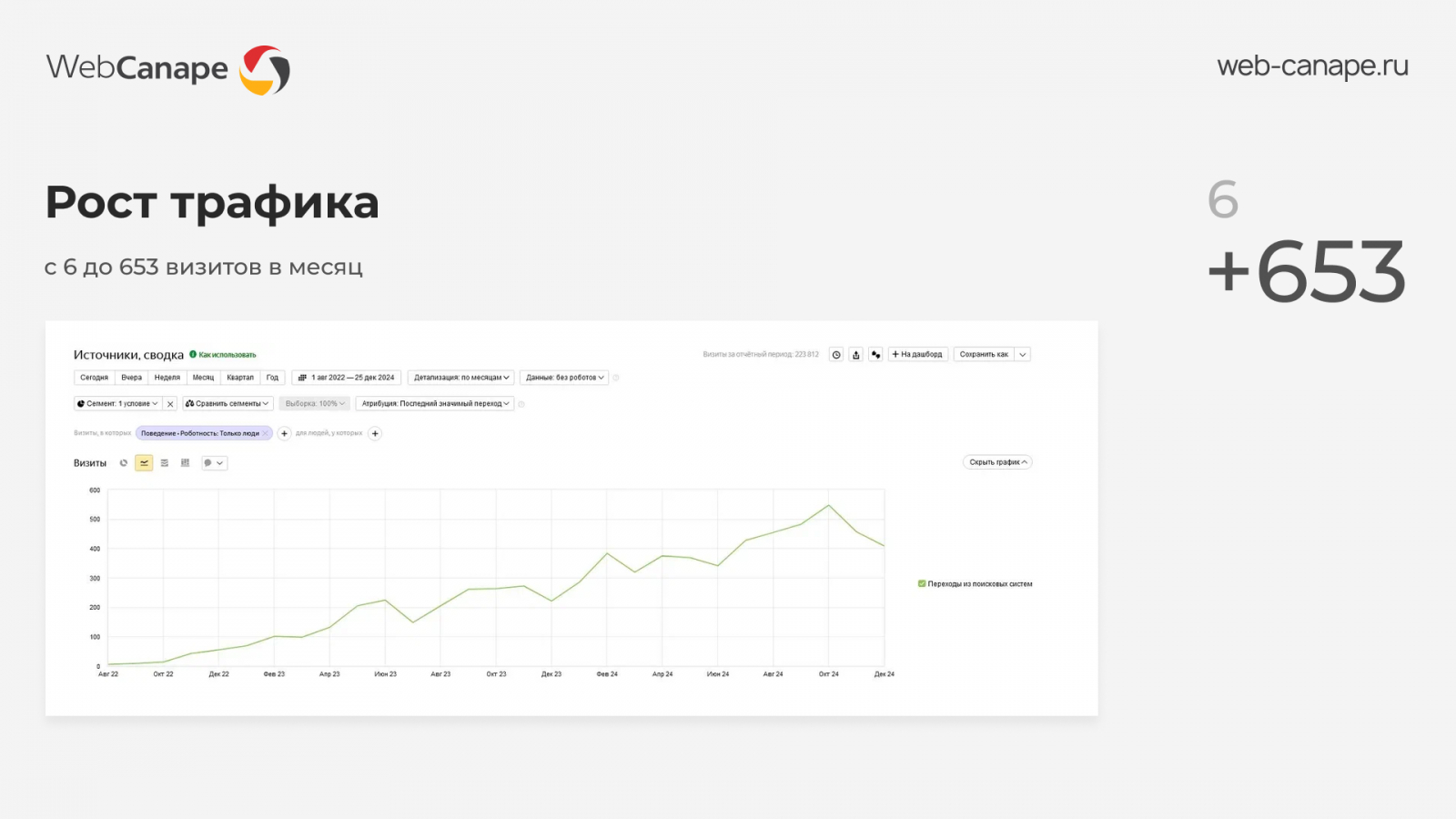 В результате органический трафик вырос с 6 до 653 визитов ежемесячно.