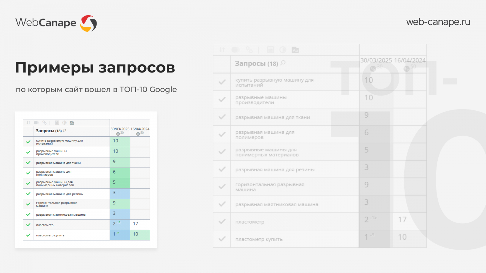 По некотором ключевым для бизнеса запросам сайт занял ТОП-1 в Google, например по «пластометр купить», «разрывная маятниковая машина» или «купить пластометры для пластмасс».