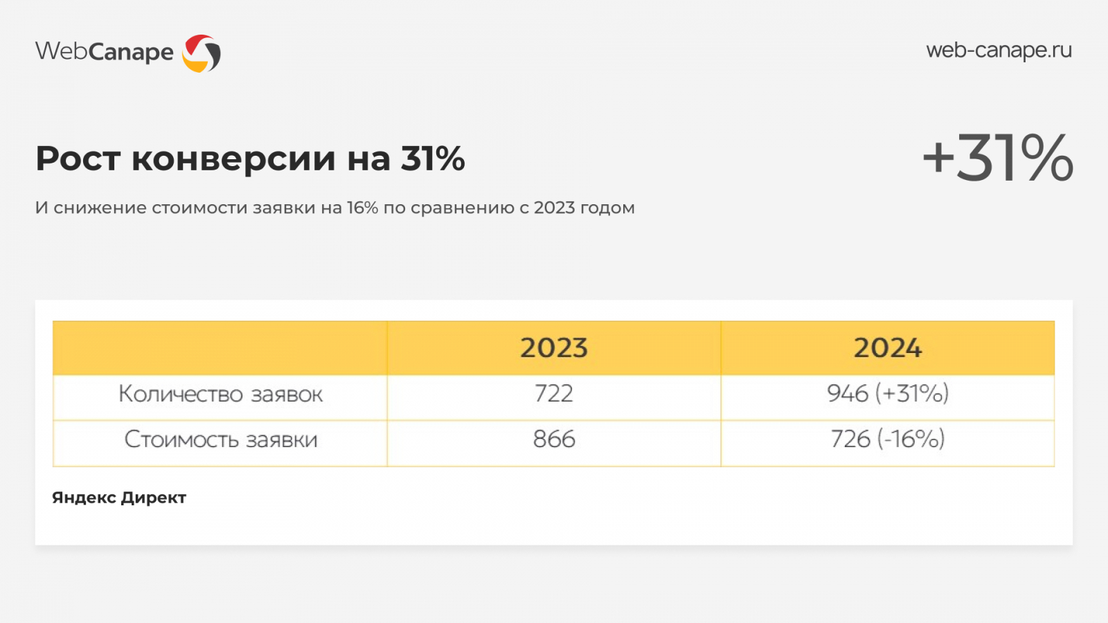 Благодаря включенности клиента мы всегда заранее знаем, какие категории товаров будут приоритетны и делаем на них упор. Совместная работа позволяет успешно масштабировать рекламу и показывать результат: рост конверсии на 31% и снижение стоимости заявки на 16% по сравнению с 2023 годом.