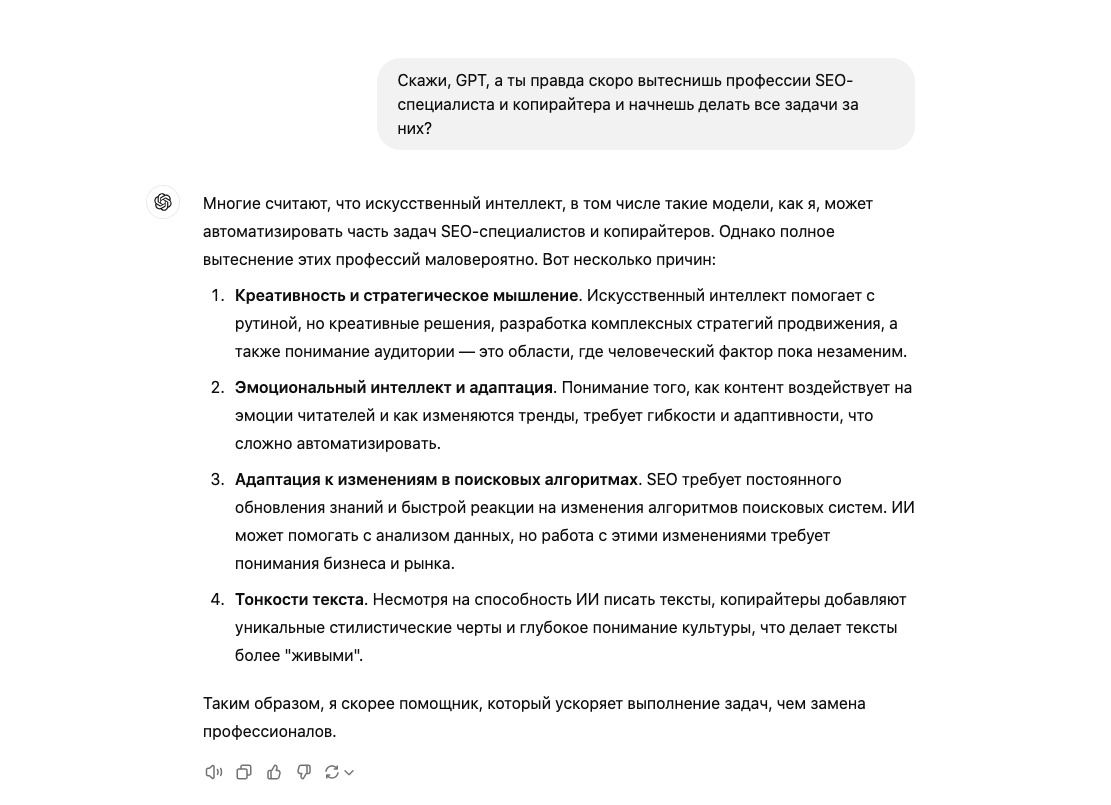 Уже никто не боится, что GPT вытеснит какие-то профессии. Чтобы окончательно в этом убедиться, мы даже задали вопрос самому искусственному интеллекту, и вот что он ответил: