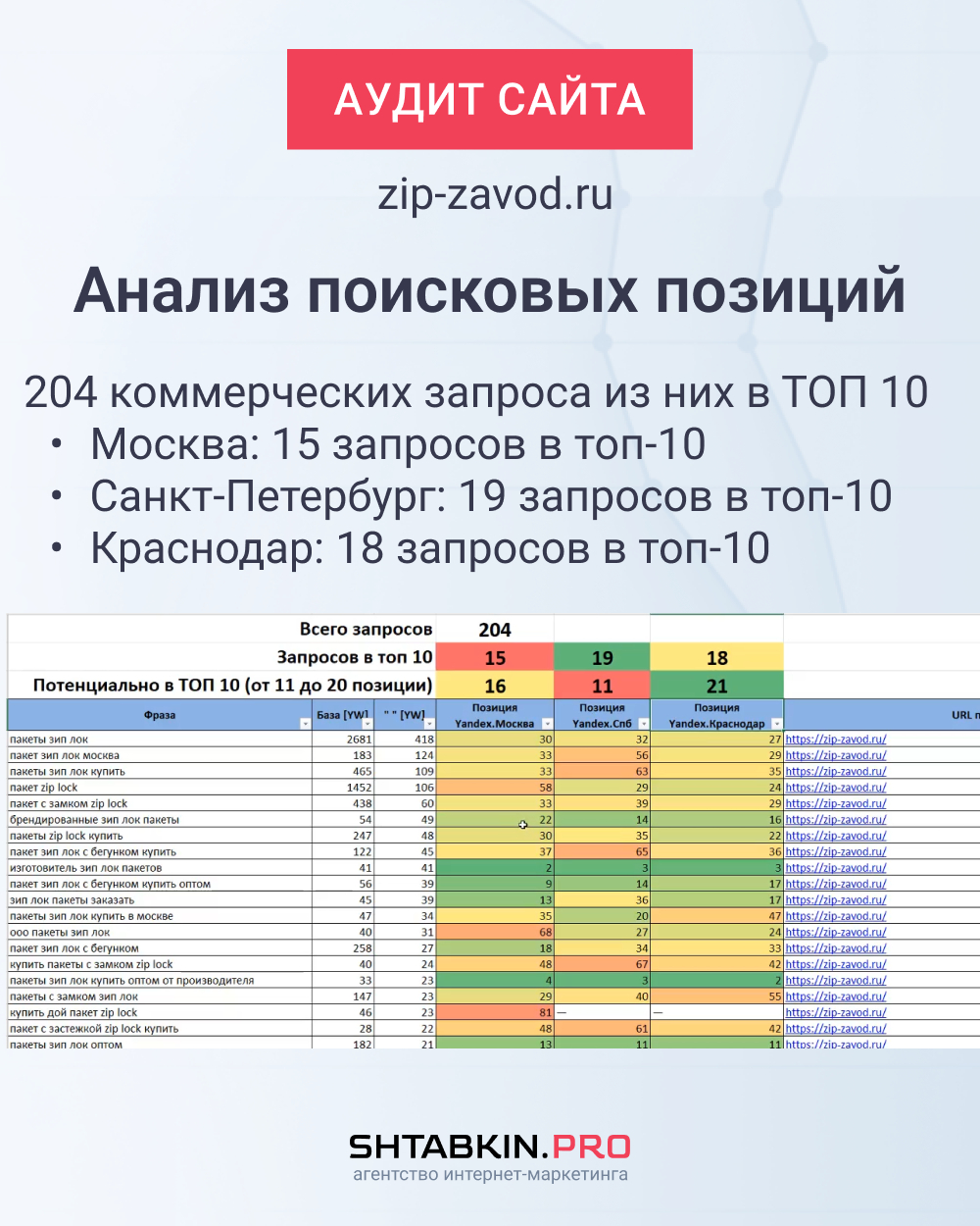 Анализ текущих позиций. Была проведена выборка из 204 поисковых запросов по Москве, Санкт-Петербургу и Краснодару.