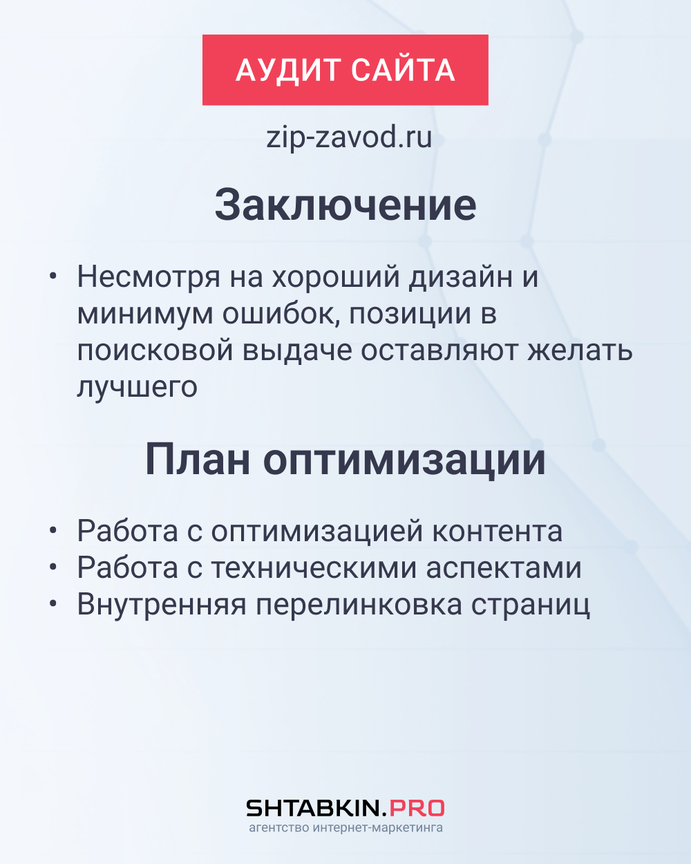 Заключение. Проведенный SEO-аудит выявил ряд областей, которые требуют улучшения. Несмотря на хороший дизайн сайта, его текущие позиции в поисковой выдаче оставляют желать лучшего. Необходима комплексная работа по оптимизации контента, технических аспектов и улучшению внутренней перелинковки.