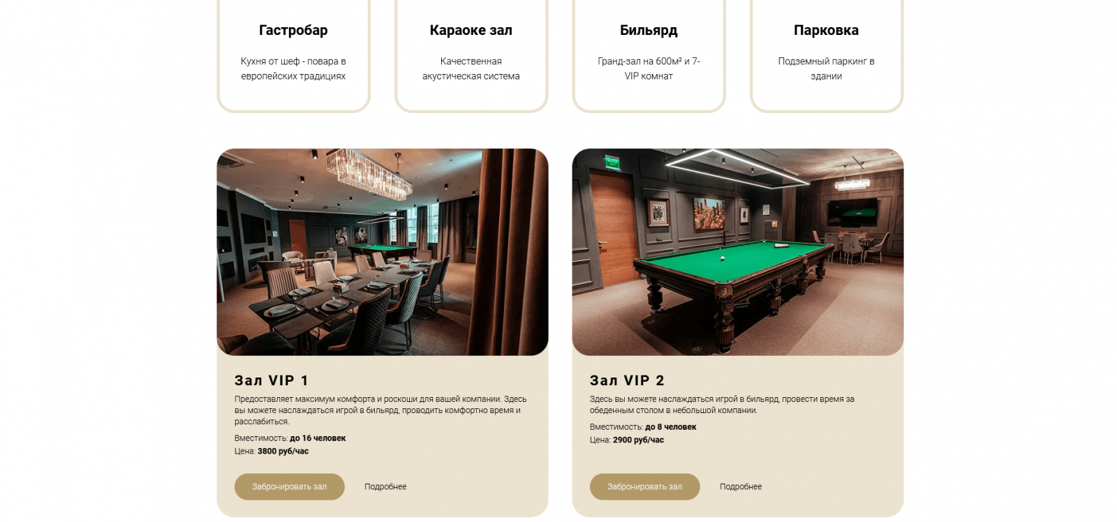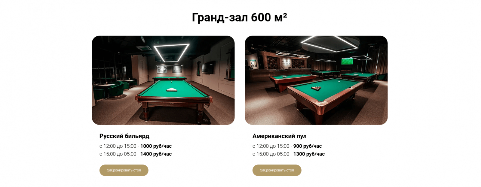 На момент начала разработки сайта, у заказчика был разработан лендинг на Tilda в фирменных цветах бильярдного клуба. Его и взяли за основу и далее всю структуру будущего сайта разворачивали на основании это стиля.
