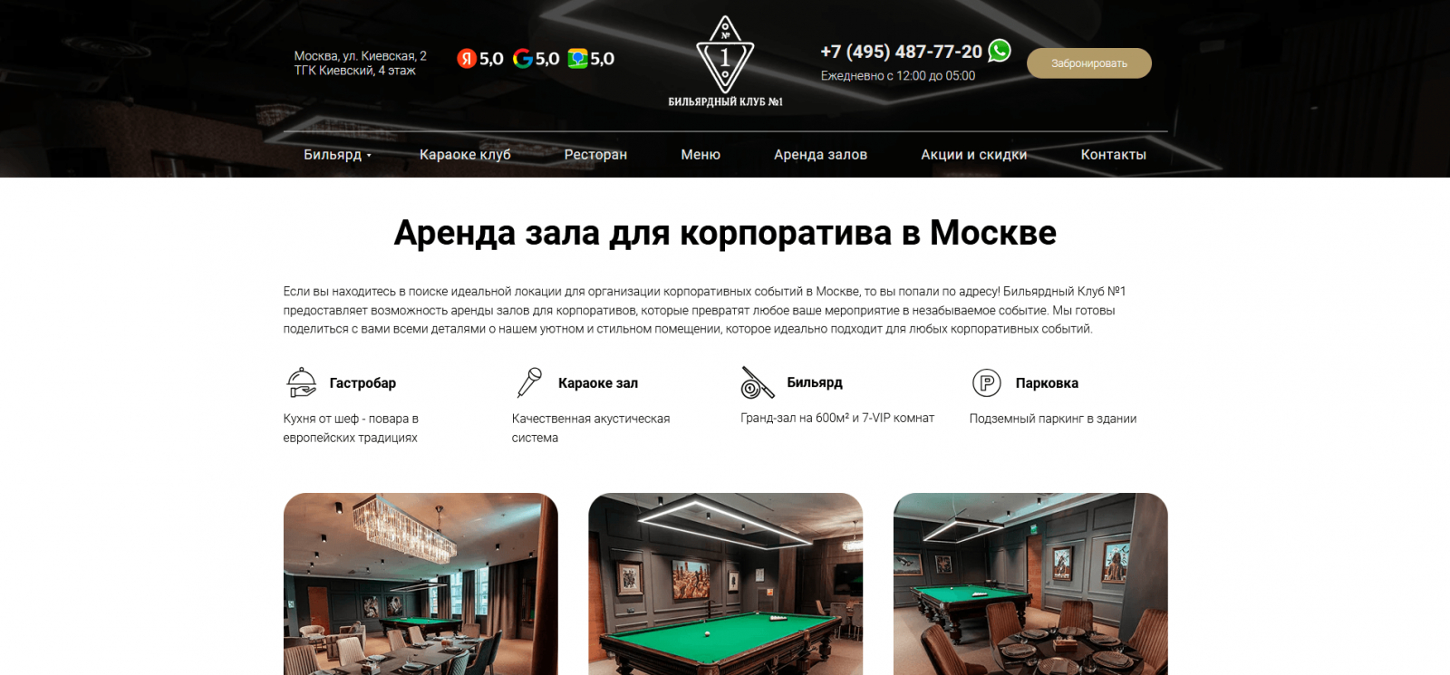 Брифинг был в офисе заказчика за чаем) общались около 3, 4 часов.Основные услуги: аренда бильярдных столов, аренда VIP комнат с бильярдными столами под мероприятия (дни рождения, корпоративы и т.д.), на этой же территории есть караоке клуб. Решение задачи:Разработка многостраничного сайта на основании анализа конкурентов и собранной семантики для охвата всего поискового трафика в нише заказчика