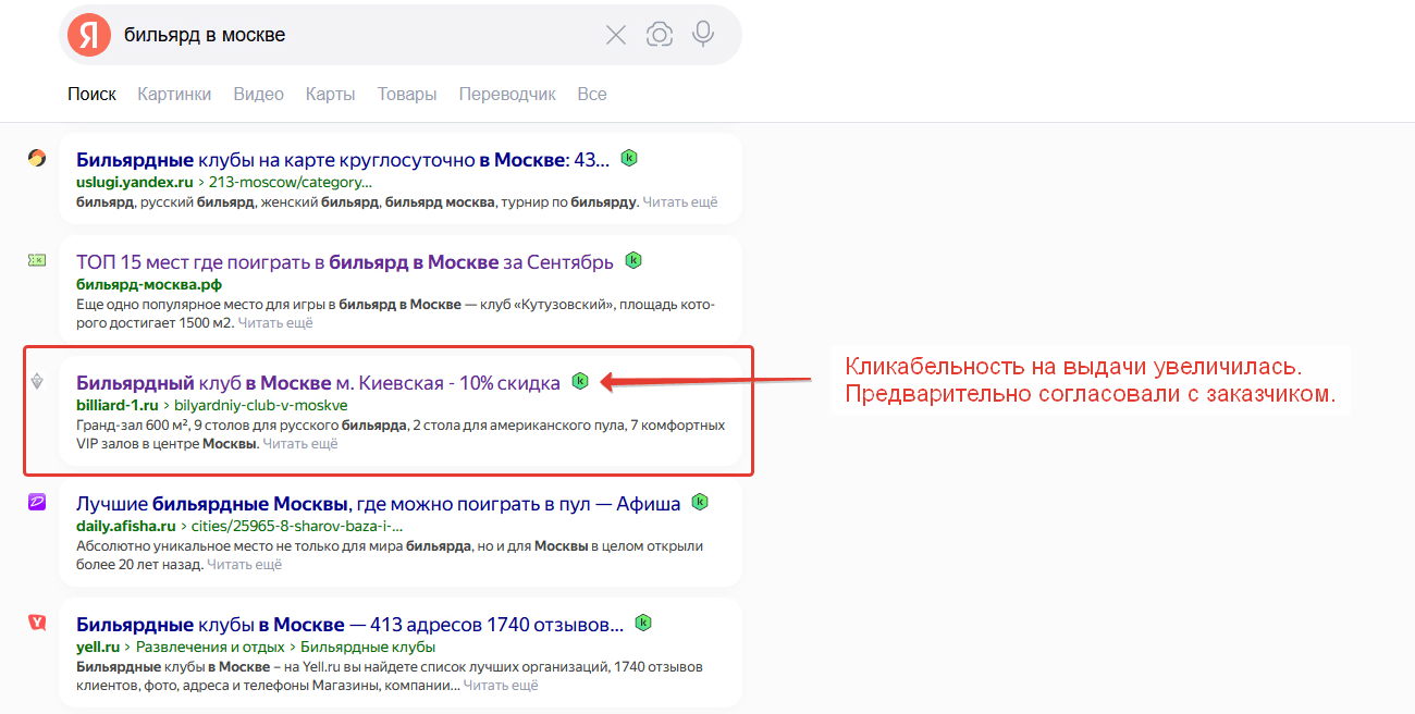 В агентстве все работы стандартизированы, с тематикой бильярда команда была уже знакома. Поэтому всё было по накатанной, из интересного могу показать что для улучшения поведенческих факторов на выдачи Yandex, применили такой лайф хак)) Прописали в title главной страницы, информацию о скидке, выглядит это так: