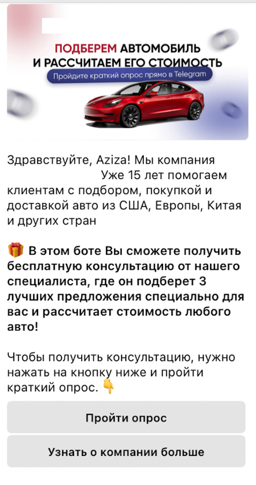 1. Пользователь видит рекламу с оффером “бесплатный расчет стоимости авто” и подписывается в бота, чтобы получить расчет.