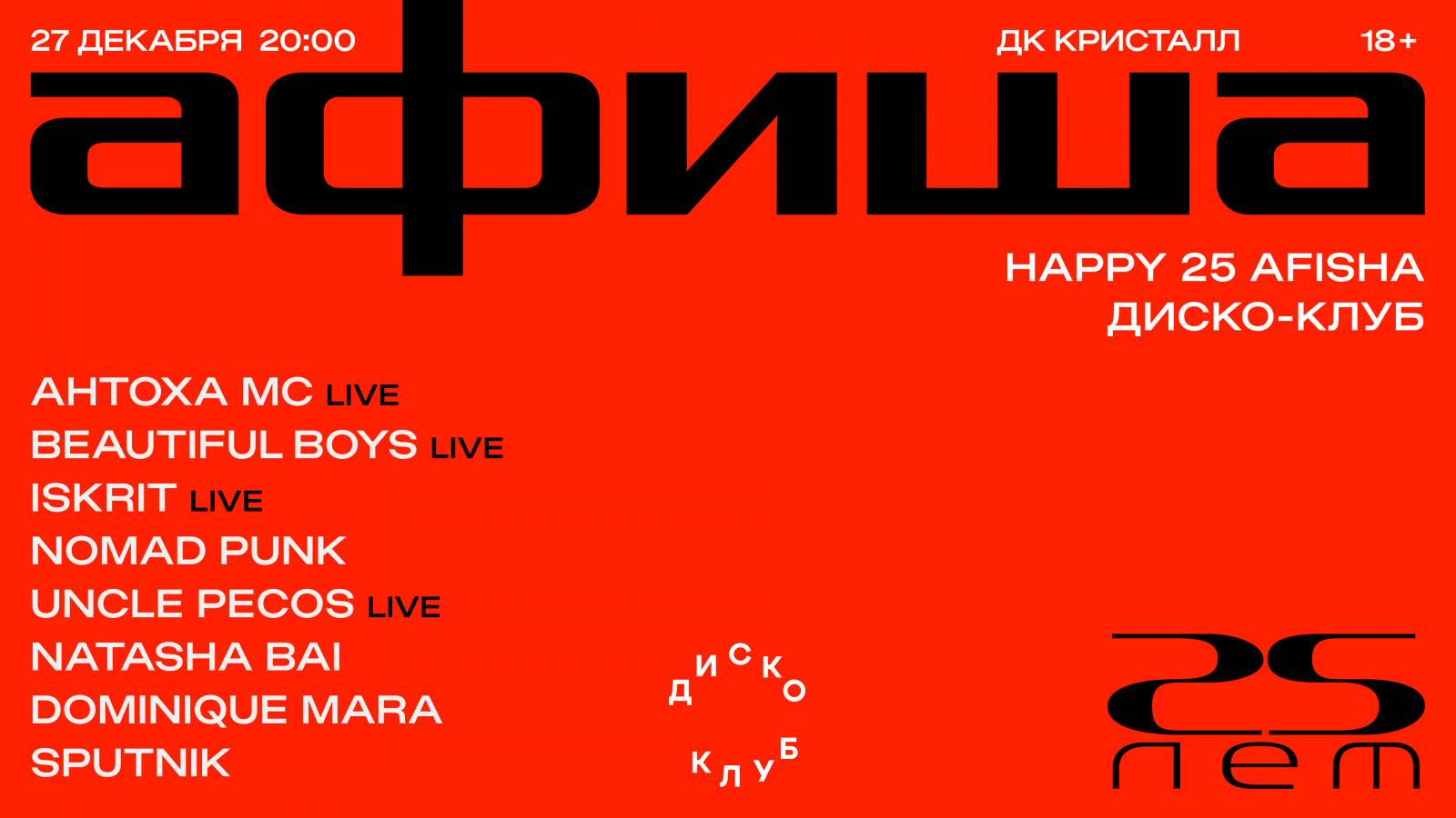 27 декабря 2024 года в ДК «Кристалл» компания «Афиша» отметит одновременно и свой День рождения, и проведёт своеобразное афтепати года. Мероприятие важно для бренда – в 2024 вернулся фестиваль Пикник «Афиши», а самой компании исполнилось 25 лет.