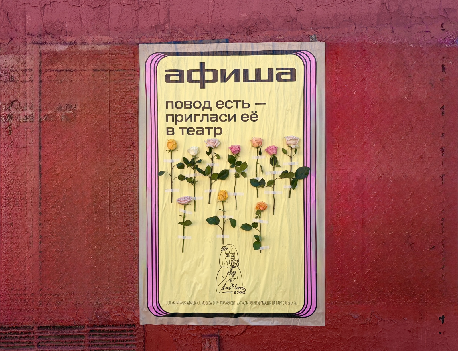 В преддверии Международного дня театра, 21 марта 2026 года, в Петербурге прошла креативная акция: в семи оживленных городских точках появились большие плакаты с призывом «Повод есть – пригласи ее в театр» и живыми цветами прямо на них, которые можно унести с собой и подарить, украсив свое приглашение. Простая и эмоциональная механика стала частью кампании от «Афиши» в двух столицах.
