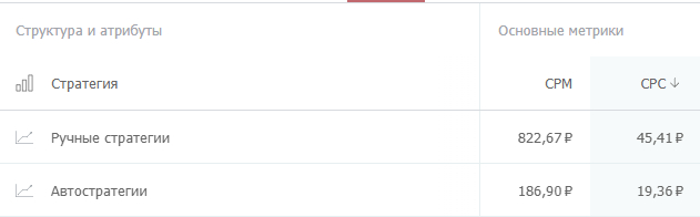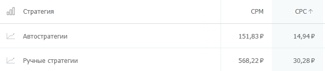 Из раздела «Стратегии» в «Пульсе click.ru» узнаем, что цена клика при использовании автостратегий более чем в 2 раза ниже, чем при ручном управлении.