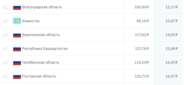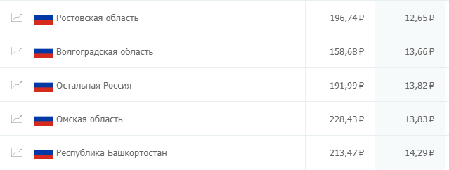 Наиболее дешевые клики можно получить в уже привычных регионах, например Волгоградской области. Обращает на себя внимание присутствие на четвертой строчке Москвы, что косвенно подтверждает предположение о сильном снижении конкуренции в столице.