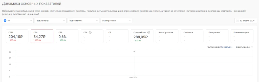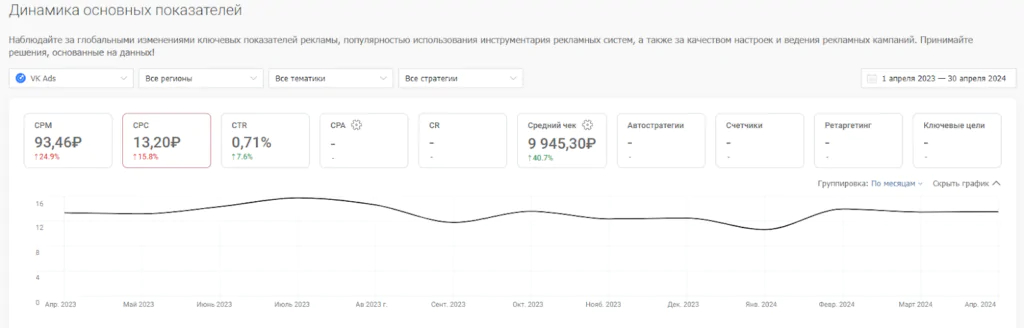 При медиапланировании нужно обязательно анализировать информацию о площадке, на которой вы планируете размещать рекламу. И один из важных параметров – CPC – стоимость клика. Сервис click.ru провел исследование и сравнил CPC в наиболее популярных рекламных системах. Посмотрим данные за год с апреля 2023 по апрель 2024 года, а также проанализируем статистику на начало и конец этого периода.