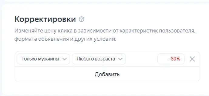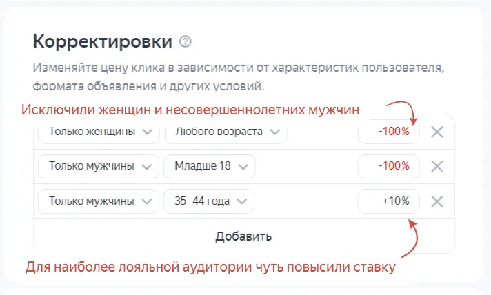1. Социально-демографические параметры (возраст и пол). Если целевая аудитория — мужчины, желательно не повышать для них ставки, а наоборот, уменьшить ставки для женщин. Например, если магазин продает рыболовные снасти, он может применить корректировку как показано на скриншоте.