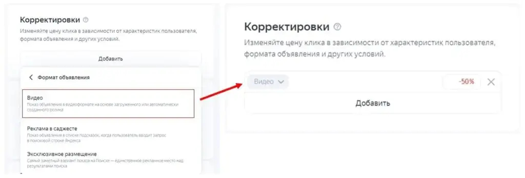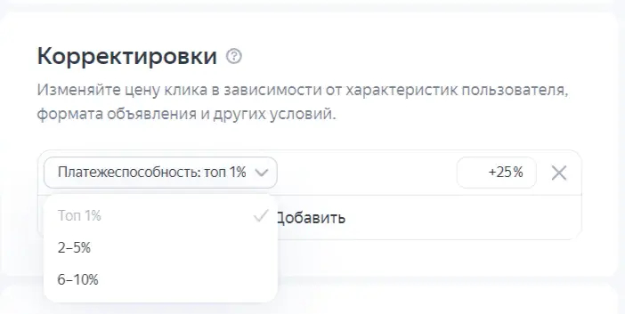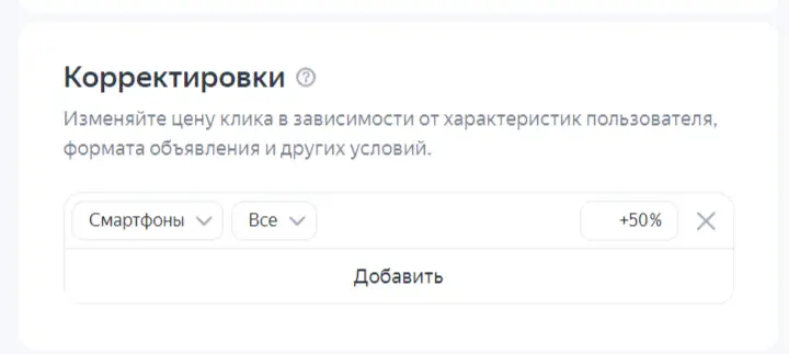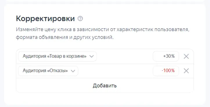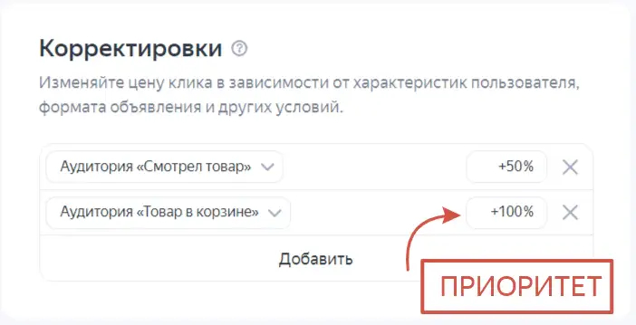 Пример: в рекламной кампании настроены две корректировки: для посетивших страницу товара — +50%, для добавивших товар в корзину — +100%. На пользователя, который попал под эти условия, будет распространяться только наибольшая корректировка — +100%.