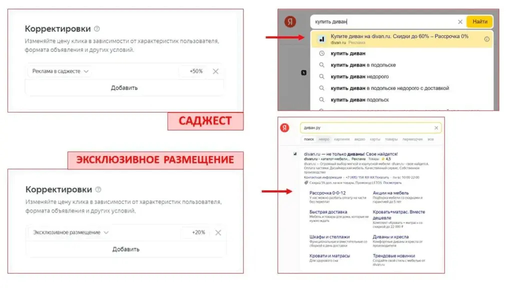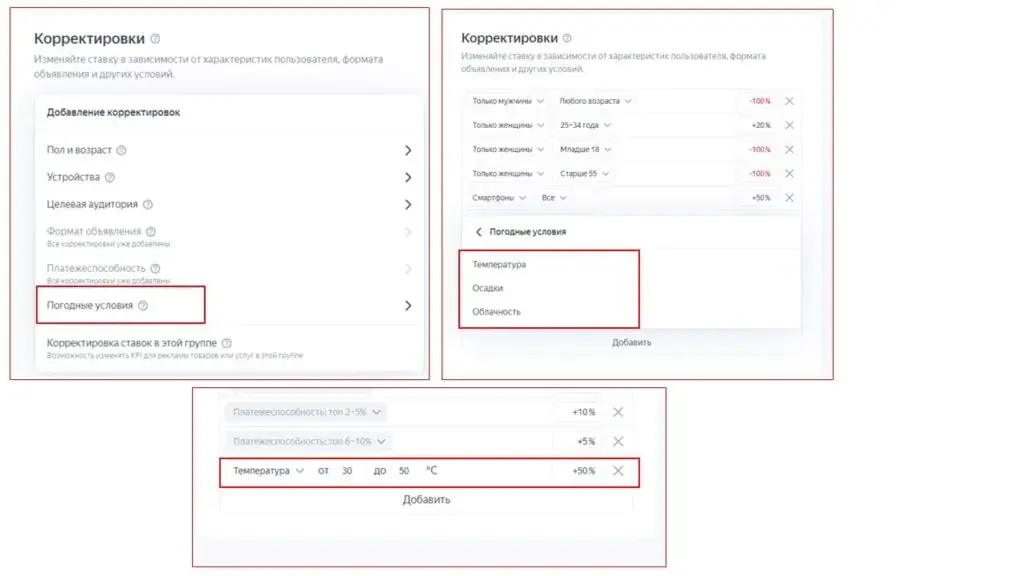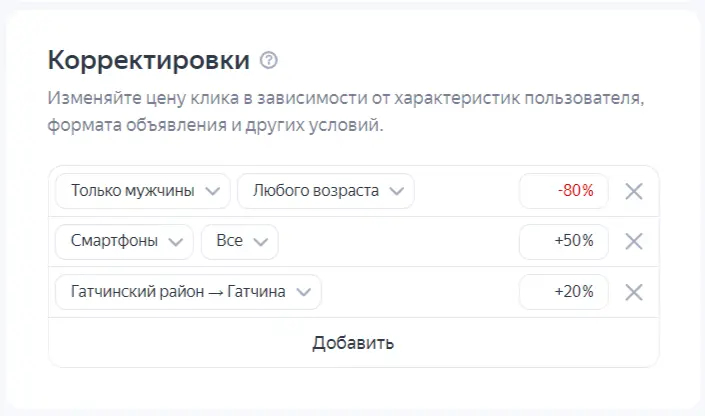 Если не проверить пересечение аудиторий в различных условиях, то корректировки могут сработать некорректно. Основное правило: если потенциальный клиент попадет в обе аудитории, то для него будет применяться наибольший установленный коэффициент.