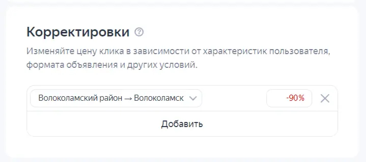3. Регион. Коэффициент можно настроить только на уровне кампании. Максимальное понижение ставки — до -90%. Подходит для рекламодателей, которым не хочется рекламироваться из крупного региона в небольшой локации.