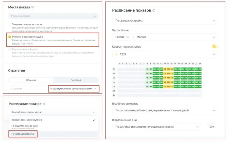 7. Время. Изменить ставку для показов в конкретное время можно исключительно в поисковой кампании с ручной стратегией. Использовать настройку можно на уровне кампании. Диапазон коэффициентов — от 0 (исключение показов) до 200 (увеличение ставки в 2 раза).