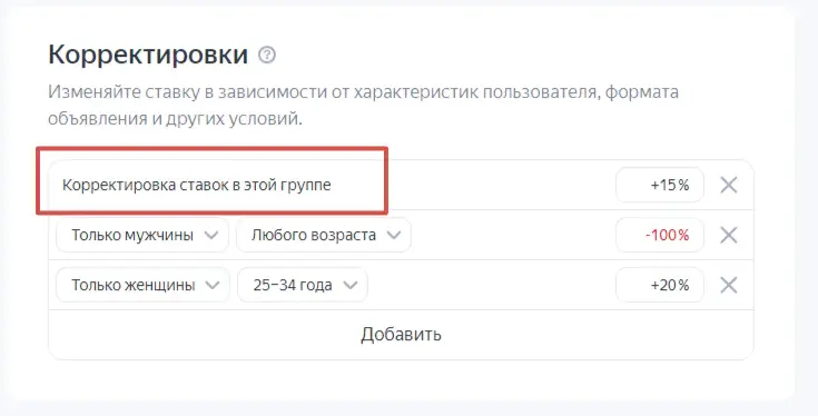 Основное правило, которое важно запомнить, — корректировки на уровне группы приоритетнее корректировок на уровне кампании. Правило распространяется на корректировки одного типа. Рассмотрим пример: