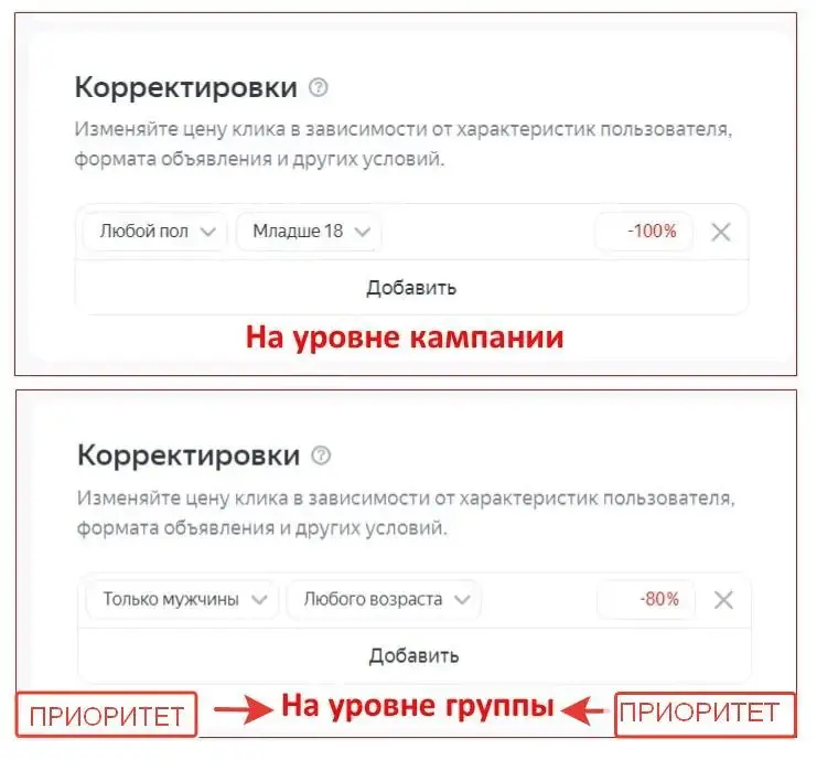 На уровне кампании задана корректировка «Пол и возраст»: любой пол до 18 лет -100%. На уровне группы задана корректировка такого же типа, но с другими настройками: -80% для мужчин всех возрастов. В нашем примере корректировка на кампании не сработает, так как ее «перебивает» корректировка такого же типа на уровне группы.