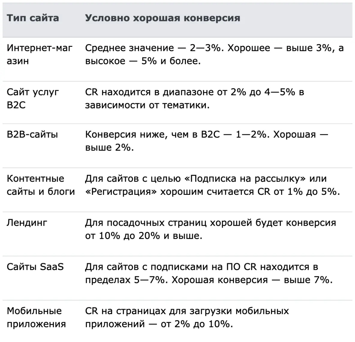 Эти цифры — примерный ориентир. Показатель хорошей конверсии для конкретного сайта зависит от разных факторов, включая конкурентную среду, аудиторию, особенности услуги или продукта.