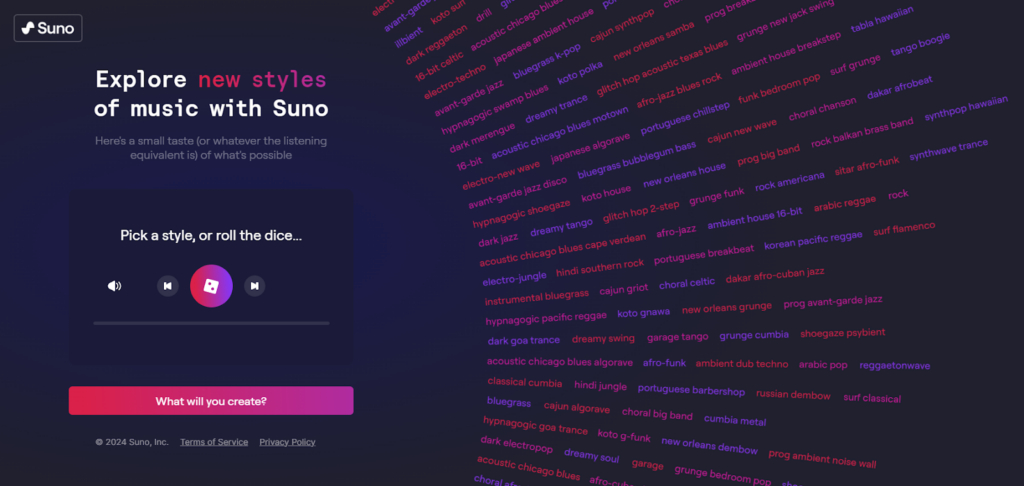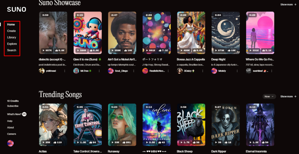 Explore. За время работы в Suno появилось множество новых уникальных музыкальных направлений: электрошансон, китайский математический рок, французский или кельтский дабстеп и другие. Познакомиться с ними можно именно в этом разделе.