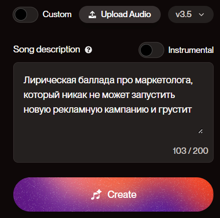 Шаг 2. Кратко указываем желаемый результат в поле Song Description. Создатели сервиса рекомендуют не расписывать поджанры и инструменты. Для нейросети достаточно описать настроение или историю.