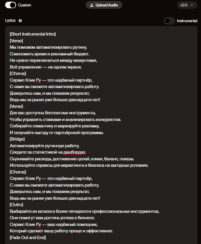 Попробуем протестировать инструмент и создать текст песни про преимущества click.ru через YandexGPT: в тексте должно быть рассказано про инструменты для бесплатной маркировки рекламы, партнерскую программу с возможностью вернуть проценты от расходов на рекламу, инструменты для автоматизации рекламных кампаний и др. Вышло не идеально, но не стоит забывать, что модели быстро обучаются.