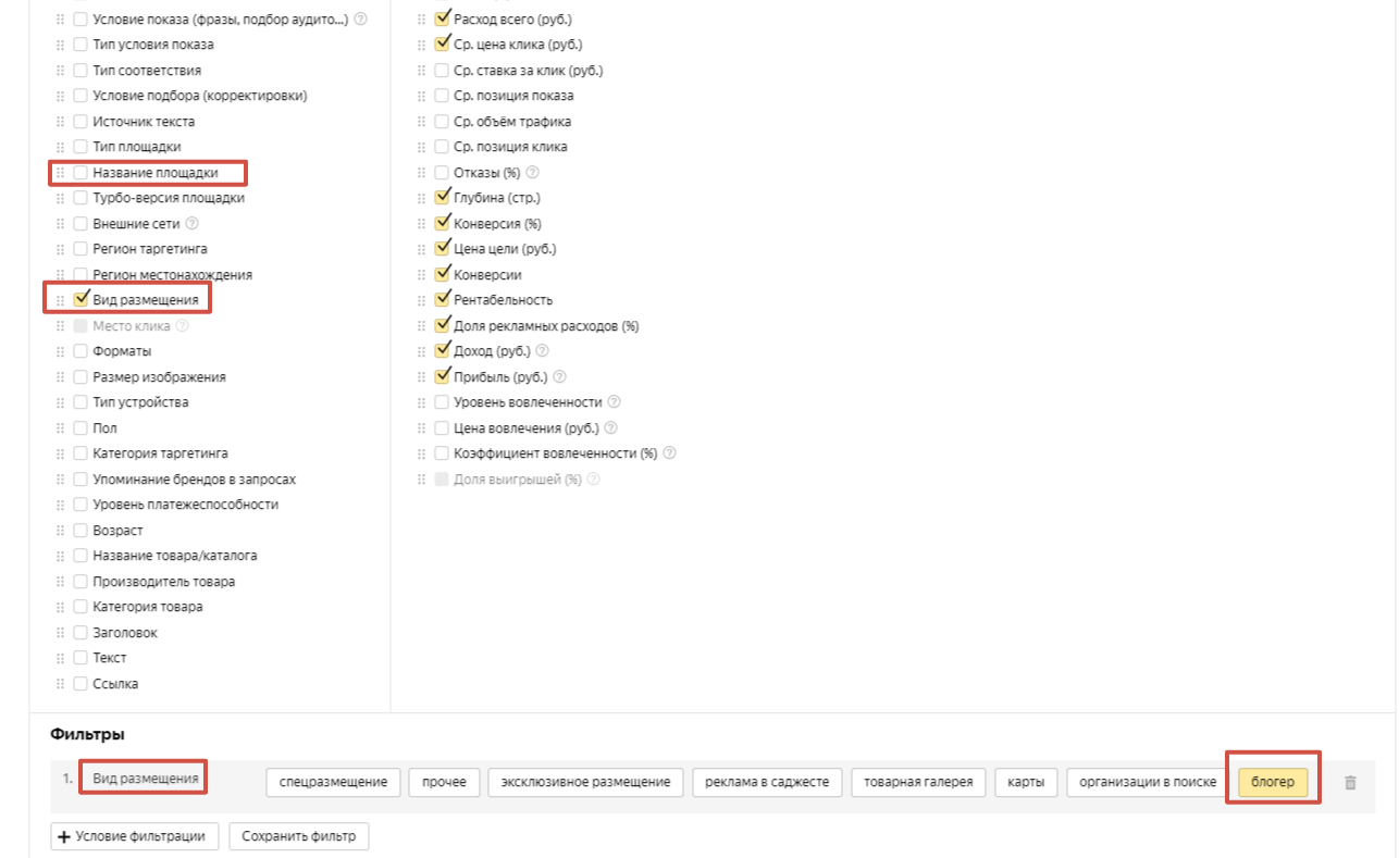 Все точно так же, как и в обычной кампании. В срезах Мастера отчетов надо выбрать «Название площадки» и «Вид размещения». При желании можно задать в фильтрах вид размещения — «Блогер».