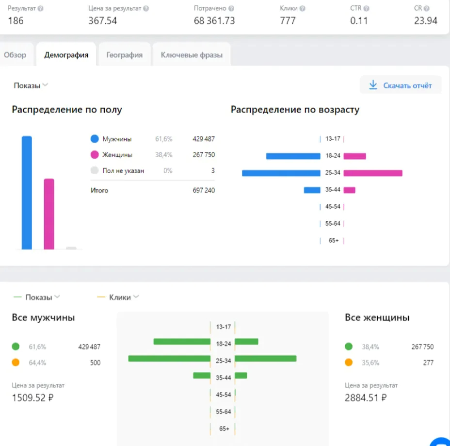 В этой вкладке можно понять, пользователи какого возраста и пола обычно видят рекламу или переходят по ней. Здесь есть два визуальных блока с графиками, расположенными друг под другом (чтобы посмотреть второй, надо прокрутить страницу).