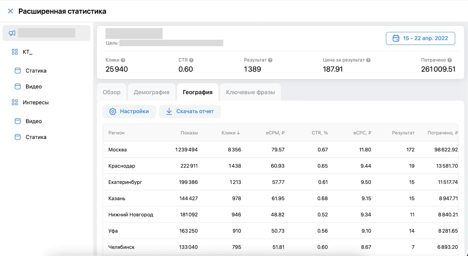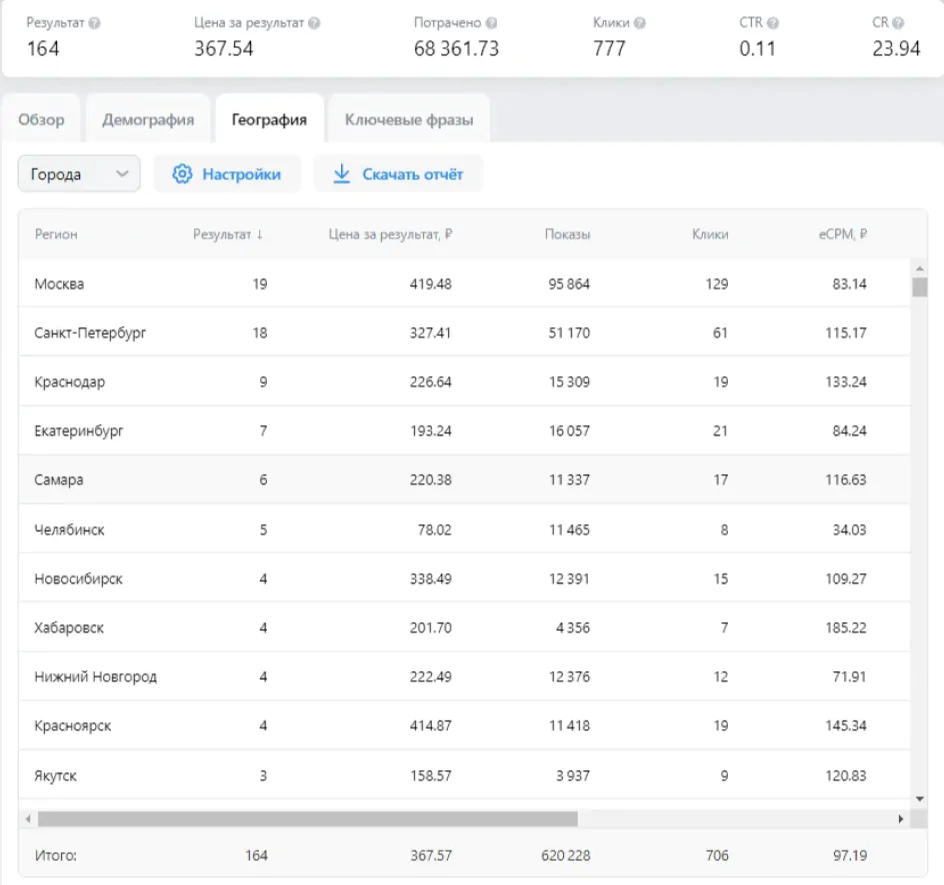 «География» отображает эффективность работы кампании в конкретном регионе: данные можно отсортировать по ключевому для рекламодателя показателю. Доступны такие данные: «Результат», «Показы», «Клики», «Цена за результат», «eCPM».