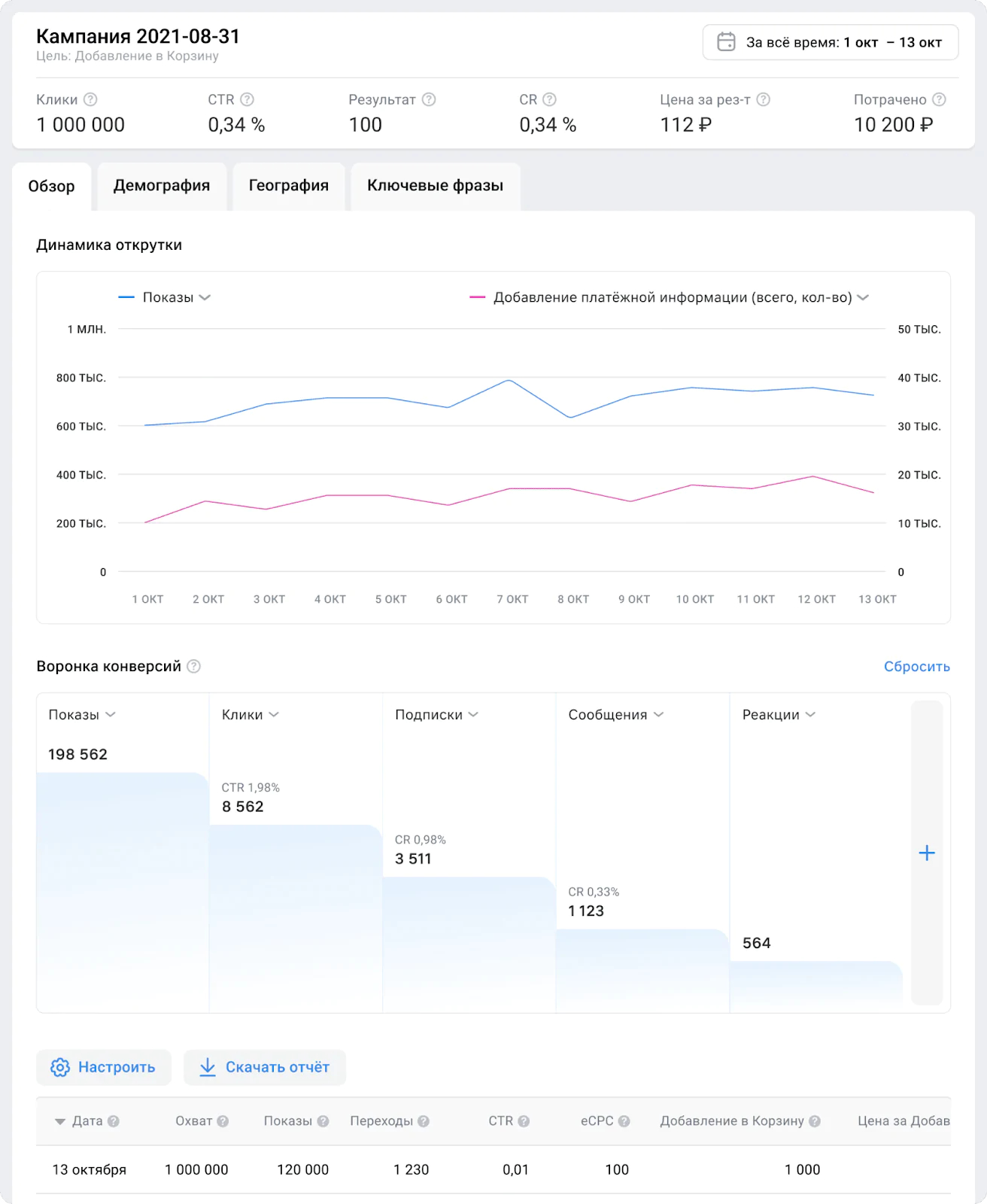 Это дополнительный график, позволяющий с помощью нескольких метрик отслеживать движения пользователей по конверсионным воронкам. Воронки доступны для нескольких уровней рекламы: группы, объявления, кампании.