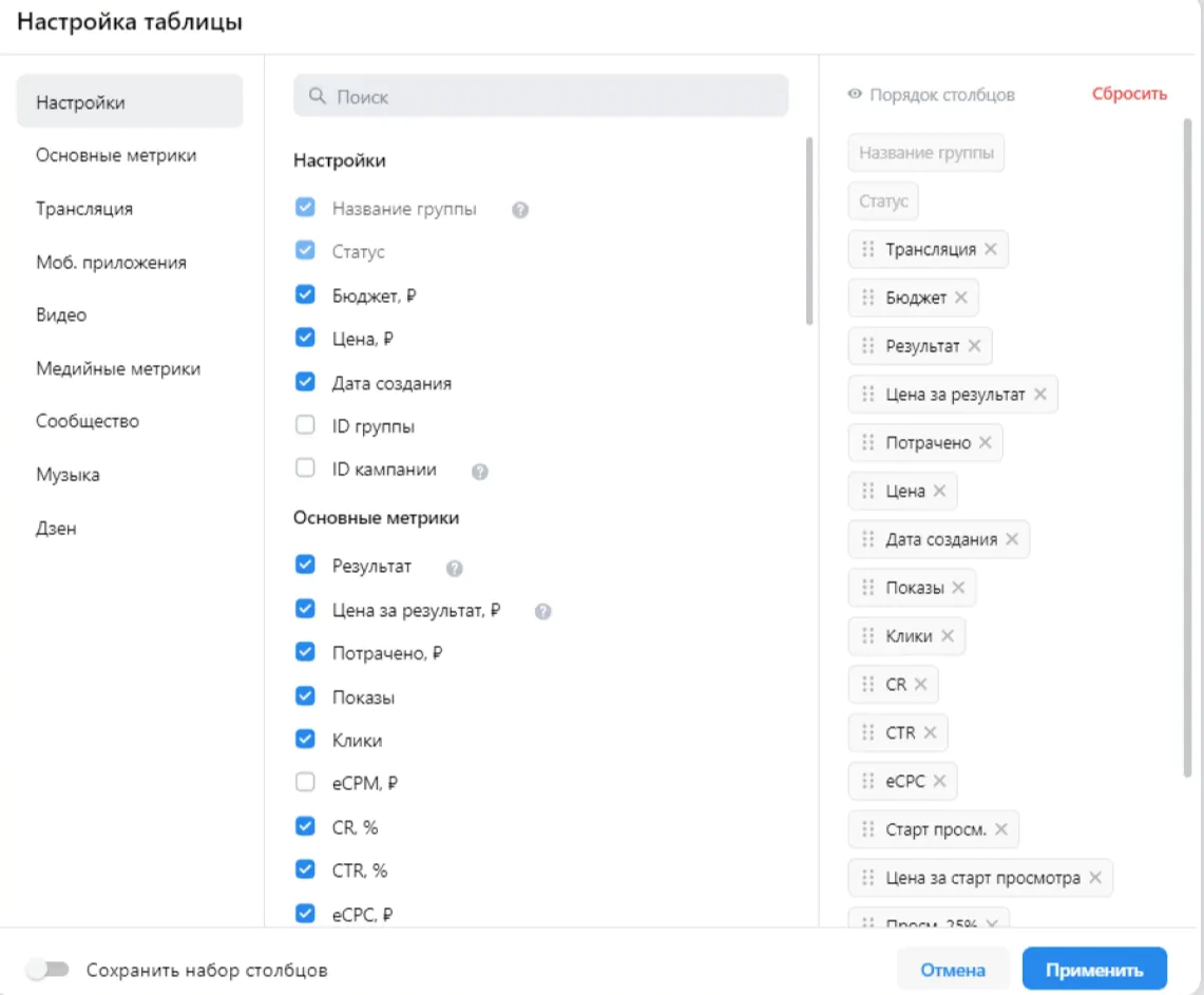 Если рекламодатель отслеживает разные метрики для нескольких кампаний, он может создать пресеты и легко переключаться между ними. Для этого достаточно передвинуть переключатель «Сохранить набор столбцов» перед нажатием на «Применить». Этот пресет автоматически применится к текущему дашборду. Потом его можно отредактировать. Переключаться между пресетами можно в «Настройках». Всего доступны 4 пресета. При достижении лимита нужно будет удалять лишние или редактировать существующие.
