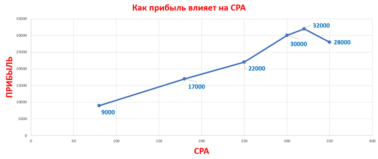 Зависимость прибыли от стоимости конверсии (CPA) нельзя назвать линейной. Если бы это было так, то все было бы просто — увеличиваем CPA, растет конверсионность и вместе с ней прибыль. Но на практике ситуация сложнее.
