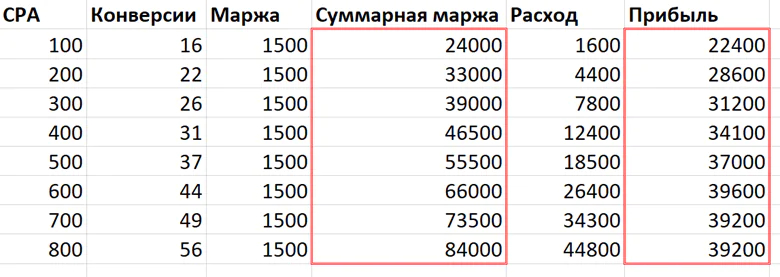 Рост CPA действительно приводит к большему числу конверсий, однако одновременно увеличиваются и расходы, что напрямую снижает итоговую прибыль. В таблице ниже видно: рекламодатель шаг за шагом повышал стоимость конверсии, получал больше лидов, но прибыль при этом не увеличивалась — в какой-то момент кривая вышла на плато. Дальнейшее повышение CPA в такой ситуации лишь ускорит падение прибыли.