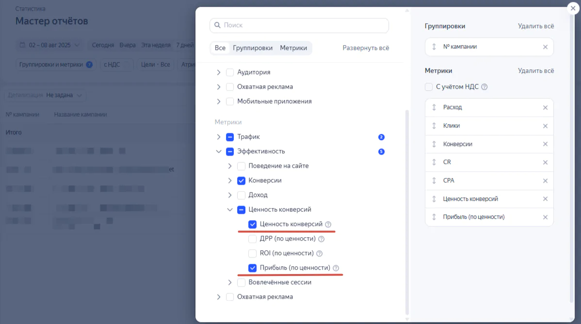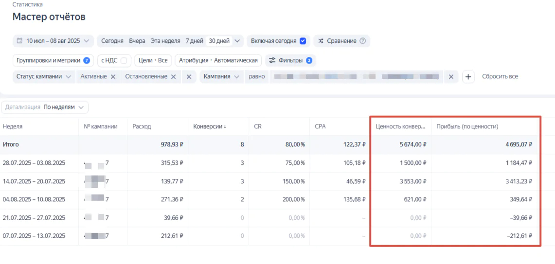 Сначала стоит дать стратегии время на разгон — примерно пару недель, чтобы накопилась достаточная статистика. Отслеживать результаты удобно в «Мастере отчетов», где ключевыми будут метрики «Ценность конверсий» (суммарная маржа) и «Прибыль (по ценности)» (это полученная суммарная прибыль).