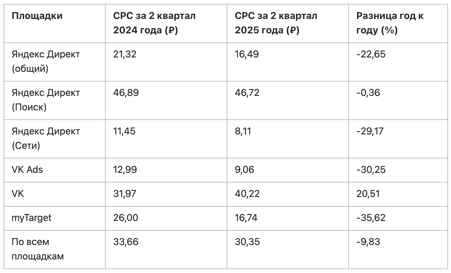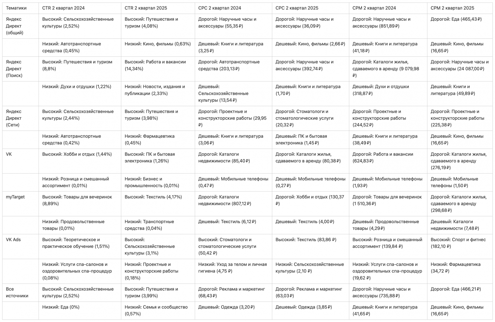 Первое, что мы рассмотрим в нашем исследовании рекламного рынка вторых кварталов 2024 и 2025 годов — это CPM, CPC, CTR. Мы узнаем, в каких тематиках и в каких регионах дешевле и дороже было продвигаться на разных площадках.