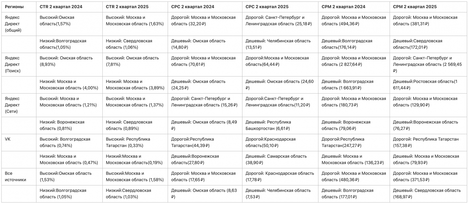- CPM и CPC у лидеров по регионам во втором квартале 2025 года зачастую ниже, чем в 2024 году.