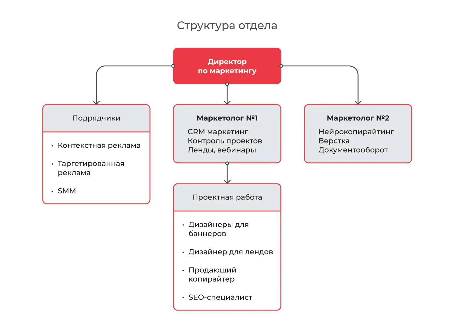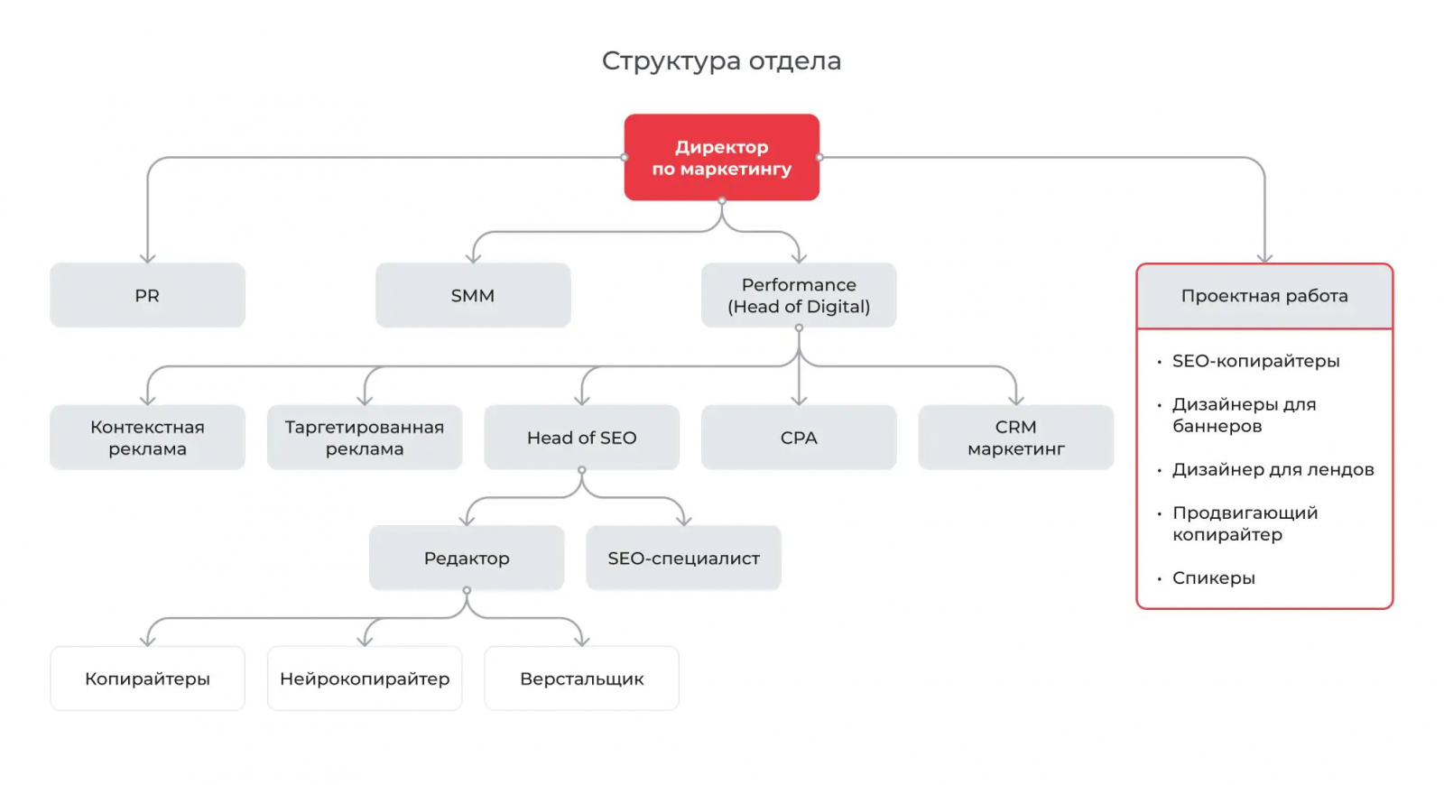 Обычно структура отдела маркетинга в большой компании выглядит так: много ролей, зон ответственности и проектной работы.