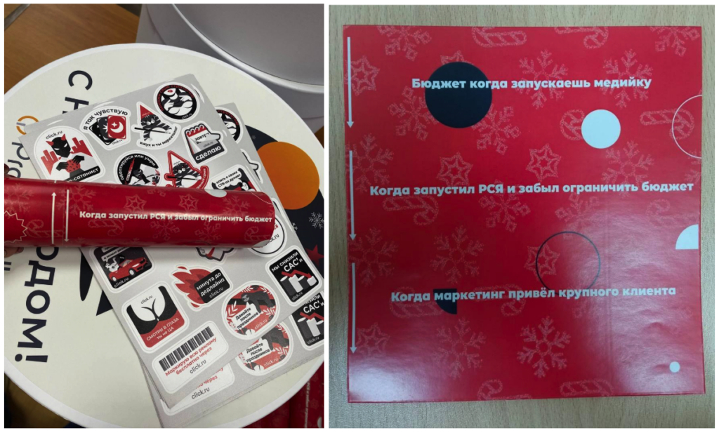 Все предметы подбирались с учетом фирменного стиля click.ru и тоже брендировались.