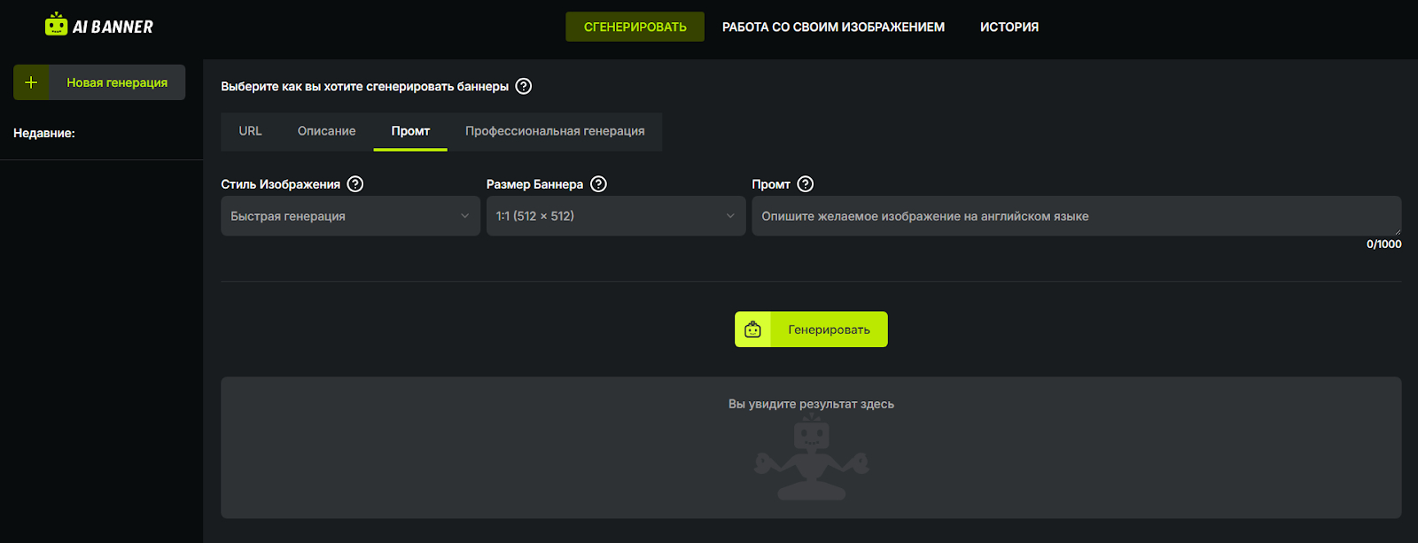 Генерация изображений. Создание логотипов, баннеров, обложек и других креативов по промту, описанию или ссылке на сайт. Можно выбрать размер от 512×512 до 1024×1024 и режим работы (анимация, идеальный, быстрый, фотореалистичный и другие).