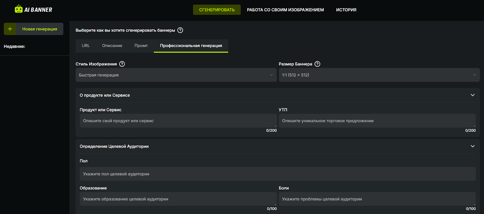 Профессиональная генерация. Чтобы получить максимально точный результат, можно описать концепцию, бренд, целевую аудиторию, УТП и цель использования изображения.