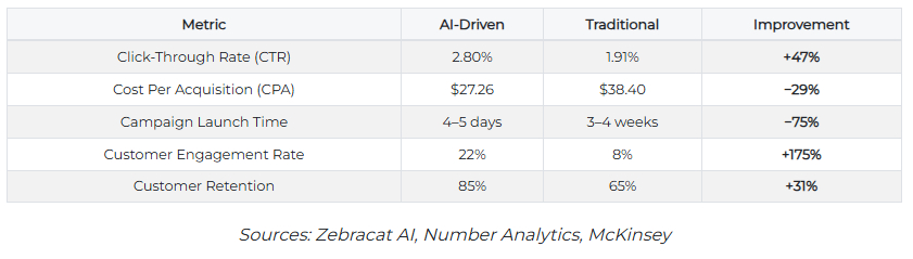 CR. Как упоминается в отчете ZebracatAI, AI-креативы способны увеличить конверсию примерно на 32%. Чаще всего за счет более точного визуального и текстового попадания в мотивацию аудитории.