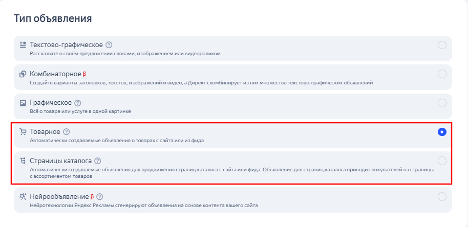Важно учитывать, что товарные объявления и страницы каталога работают исключительно по автотаргетингу — ключевые фразы здесь недоступны. Поэтому важно внимательно настраивать категории автотаргетинга и заранее продумывать список минус-фраз.
