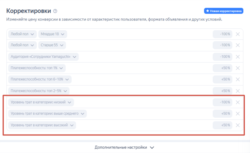 Точные диапазоны трат не задаются вручную — Директ сам относит пользователей к соответствующим категориям на основе их поведения.