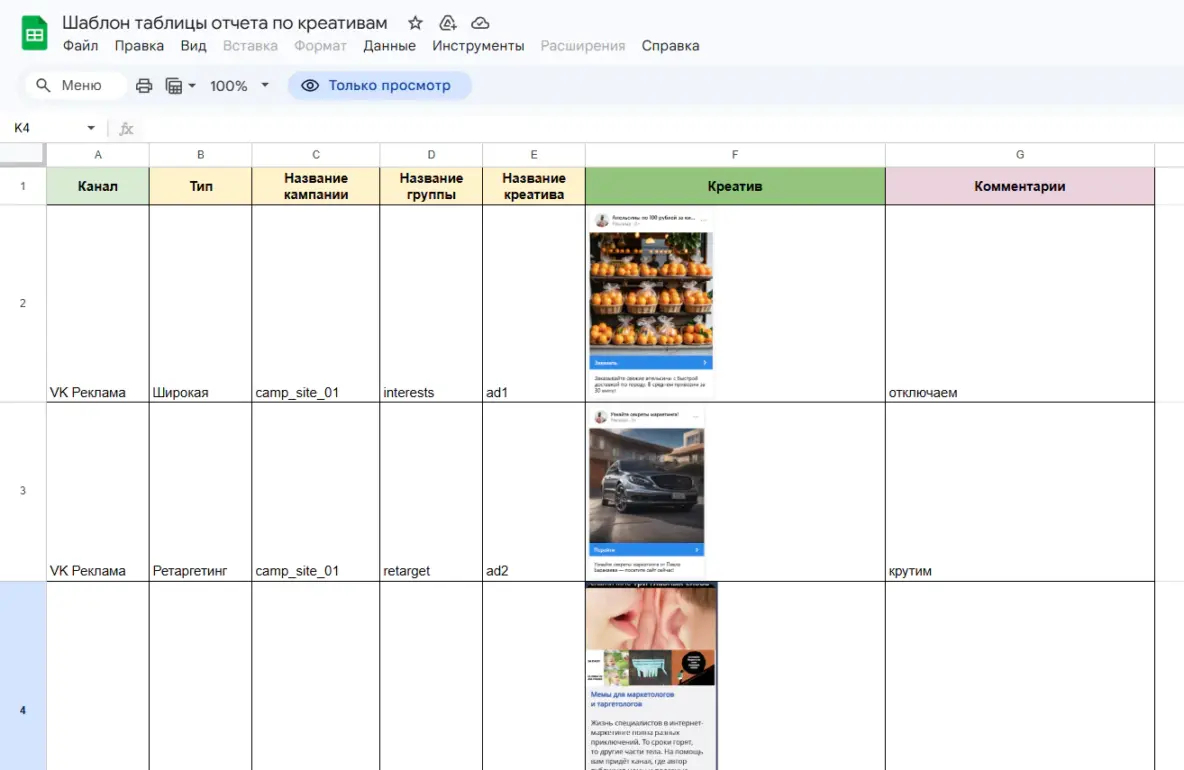 Если воронка состоит из нескольких этапов, важно смотреть не только на количество лидов, но и на их качество. Для этого удобно вести отдельную таблицу по креативам и сравнивать их между собой: какие объявления действительно приводят к продажам, а какие нет.