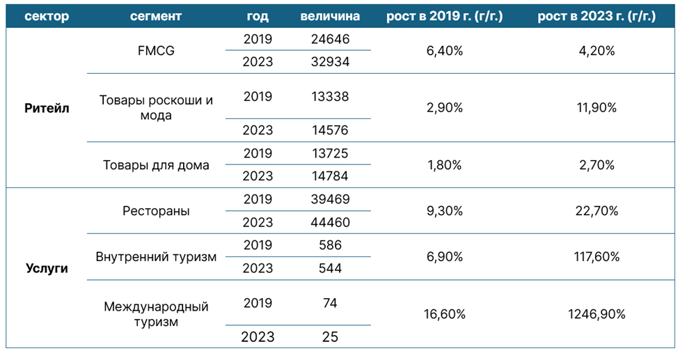 Обращаясь к отдельным сегментам, мы можем пронаблюдать позитив в основных категориях продуктового рынка и сектора услуг. Уровни продаж по каждому из продуктовых сегментов превысили показатели 2019 года, активное восстановление показывает также и туризм - как внутренний, так и зарубежный. Наиболее высокие темпы роста в 2023 году показал сегмент товаров роскоши и моды (11,9%), что, в частности, отражает тенденцию роста среднего класса в Китае и его достаточно позитивный взгляд на будущий рост потребления.