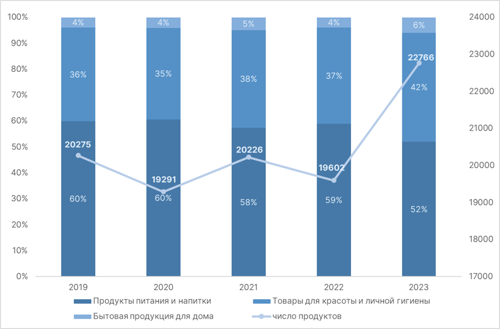 Так, в 2023 году число новых FMCG продуктов составило около 22,8 тыс, увеличившись на 16% по сравнению с уровнем 2022 года. В особенности высокие темпы прироста были характерны в таких сегментах, как товары для дома (+57%), а также товары для красоты и ухода за собой (+32%).