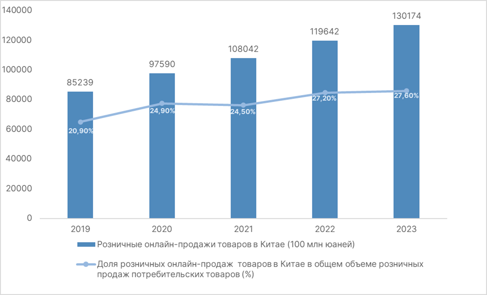 На этом фоне хорошо себя чувствуют розничные онлайн-продажи, динамика которых является лучшим показателем состояния электронной коммерции в Китае. С 2019 по 2023 гг. они выросли более чем в 1,5 раза, при этом доля онлайн-сегмента в розничных продажах выросла с 20,9% до 27,6%. Китайский онлайн-ритейл использует преимущества цен и потребительского опыта для дальнейшего укрепления своих позиций на потребительском рынке. В условиях, когда китайские потребители стали более осторожны в вопросах потребления, их покупательские привычки постепенно смещаются в сторону онлайн-каналов, что стимулирует развитие в сфере электронной коммерции.