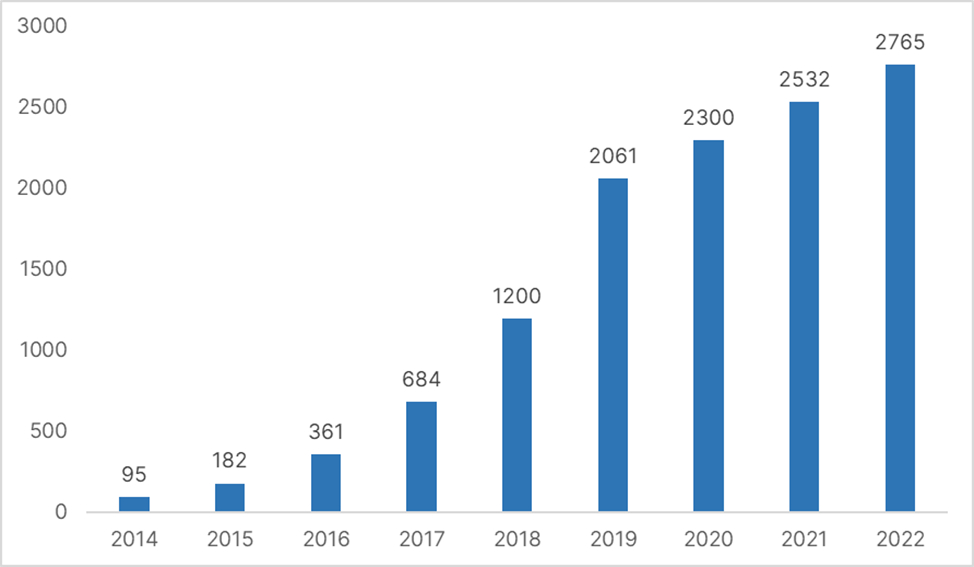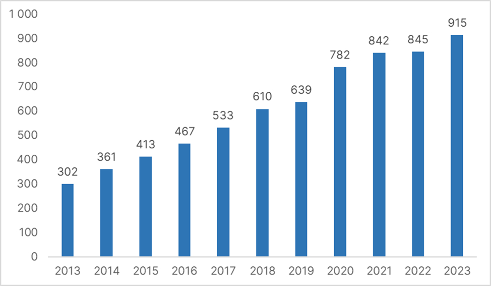 Рост числа интернет-пользователей неизбежно ведет к росту вовлеченности китайцев в использование e-commerce инструментов. В частности, можно также проследить активный рост числа онлайн-покупателей. С 2013 года их количество выросло более чем в 3 раза, составив в 2023 году 915 млн человек (83,8% от числа интернет-пользователей в Китае).