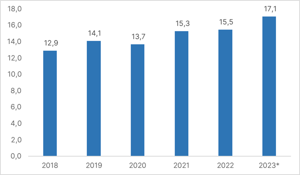 Завершение пандемии COVID-19 на территории КНР обозначило восстановление китайского потребительского рынка в 2023 году. Так, за этот период объем розничных продаж потребительских товаров в стране составил 47,15 трлн юаней, что на 7,2% больше, чем в 2022 году. Среди них розничные продажи потребительских товаров за исключением автомобилей составили 42,29 трлн юаней, увеличившись на 7,3%.